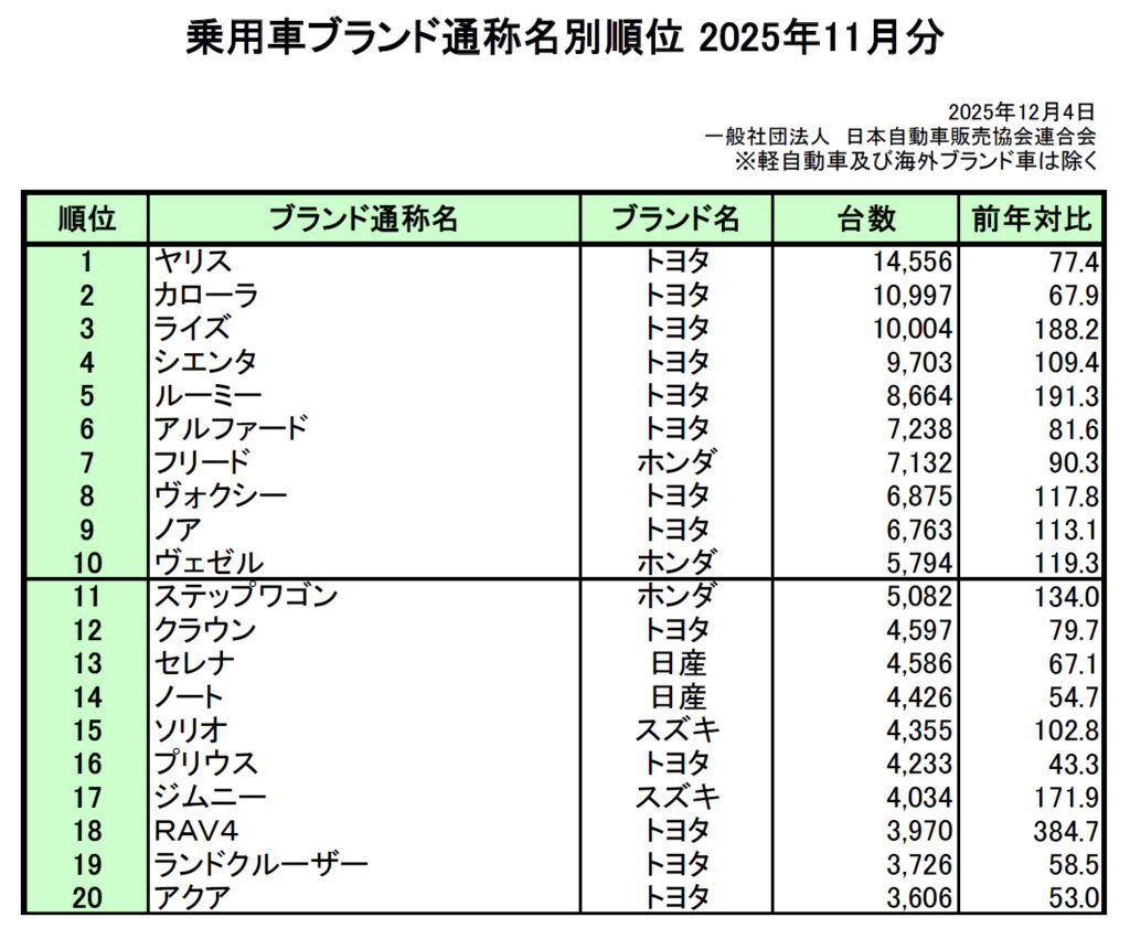 2025年11月 普通自動車 新車販売台数