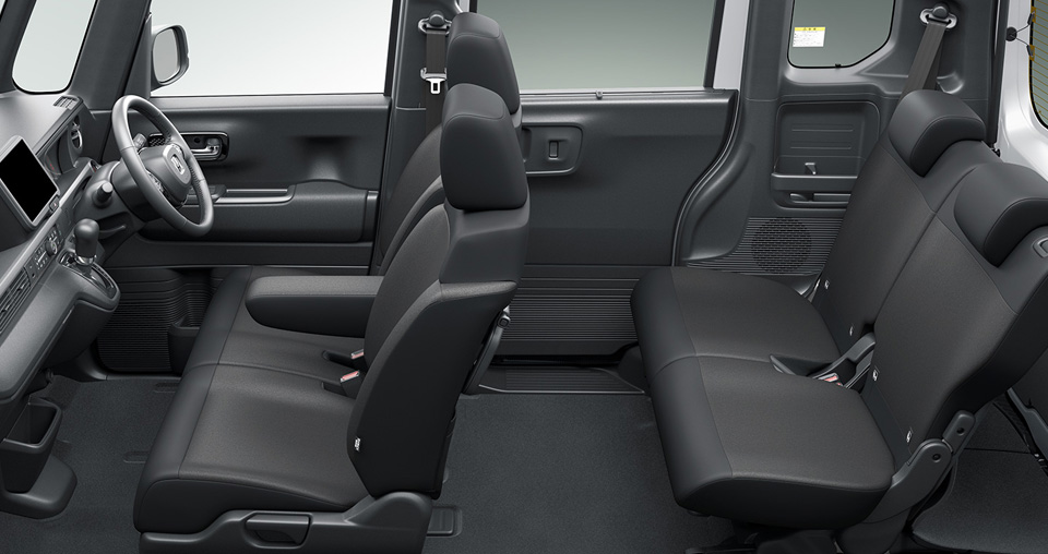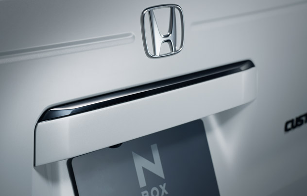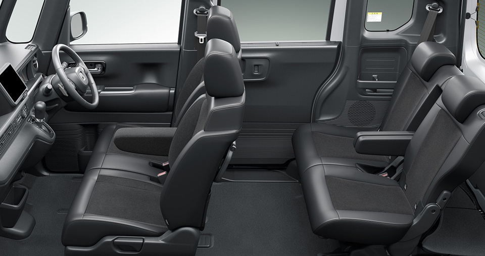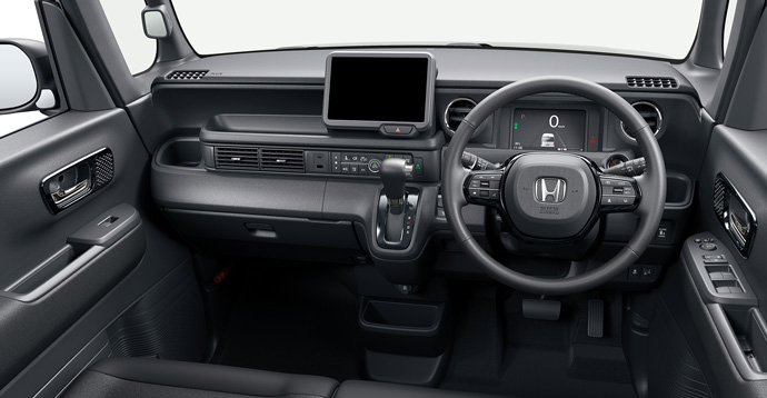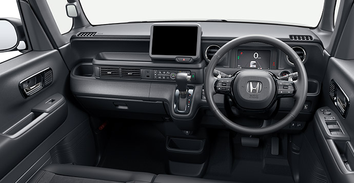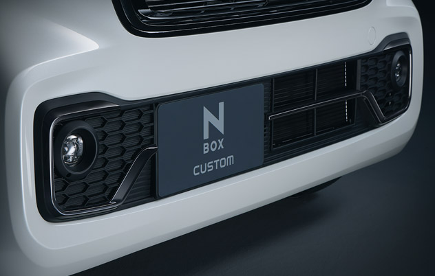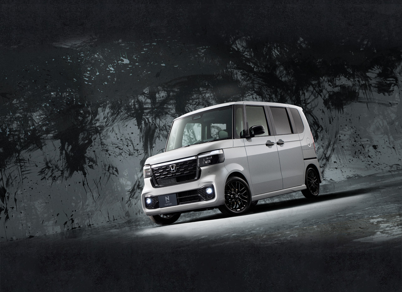 フォグライトガーニッシュやカスタムデザインフロントグリル、リアライセンスガーニッシュ、アルミホイールにベルリナブラック塗装を、アウタードアハンドルやドアミラー、N-BOX/CUSTOMエンブレムにクリスタルブラック・パール塗装をそれぞれ施すことによって、より引き締まった印象をもたらします。さらに、右側パワースライドドアに加え、コンビニフック付シートバックテーブル※4やLEDフォグライト、本革巻ステアリングホイール※5などの人気の装備を標準装備としています。