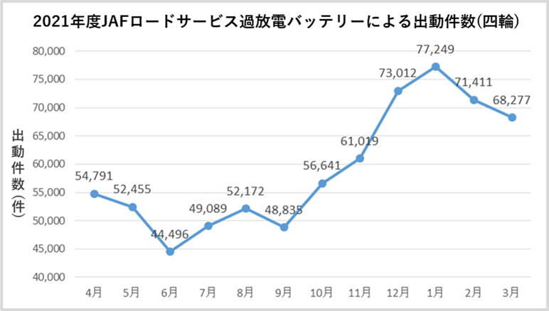 日本自動車連盟(JAF)がまとめた2021年度ロードサービス出動件数のデータを見ると、過放電バッテリー(バッテリー上がり)による出動件数は、冬にかけて増加する傾向があります。